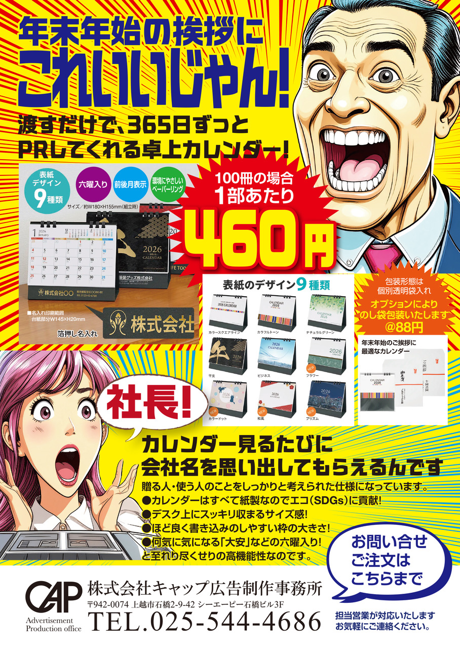NEWS CAMPAIGN 2025.11.10 卓上カレンダーPRチラシ 年末年始の挨拶や大切なお客様へ名入れ卓上カレンダーはいかがですか?「大きなカレンダー作ると高いからやめたんだよね…」や「大きなカレンダーは貼る所ないけど…」という方へもオススメです!弊社では昨年から挨拶用として使っていますが「書くところが多い卓上カレンダーは嬉しい!」や「時代と逆行してて面白いね!」などの声を頂いています! next BACK TO INFORMATION back