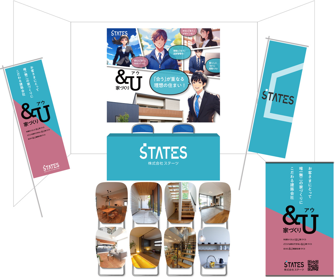 タペストリーやパネルなどを統一デザインで構成し、企業らしさがしっかり伝わる仕上がりにまとめています。